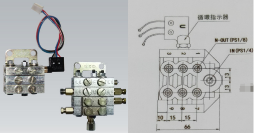 在遞進式油路分配器片組中,設有循環(huán)指示桿,分配器每一次工作循環(huán),循環(huán)指示桿動作一次,當指示桿伸出接觸到循環(huán)指示器中的微動開關,微動開關動作,以監(jiān)測潤滑系統(tǒng)是否出現(xiàn)失壓、斷流或者超負荷的狀況。