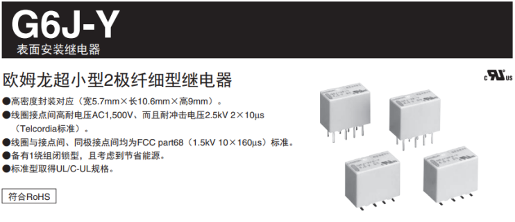 特點:歐姆龍近年來的新系列繼電器,線圈與接點間、同極接點間均為FCC part68(1.5kV 10×160μs)標(biāo)準(zhǔn)。且交貨期短,是一款高性價比之選。