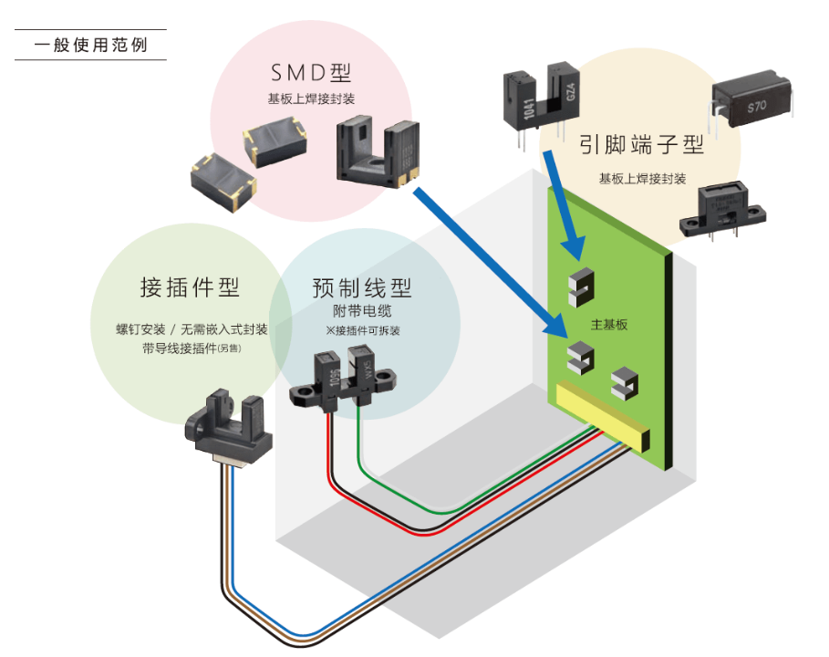 · 請根據(jù)設(shè)備選擇電路板封裝、嵌入、螺釘安裝等的安裝方法。此外,還備有表面封裝、通孔封裝、預(yù)制線連接、連接器連接等各種連接方式。