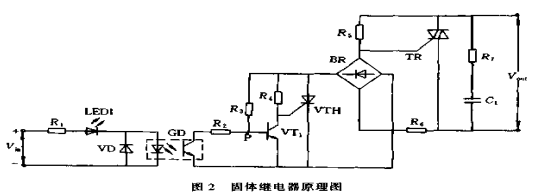 這里僅以應用較多的交流過零型固體繼電器為例,介紹其工作原理。該電路采用了過零觸發技術,具有電壓過零時開啟,負裁電流過零時關斷的特性,在負載上可以得到一個完整的正弦波形,因此電路的射頻干擾很小。該 電路由信號輸人電路、零電壓檢測控制電路、工作指示電路、雙向晶閘管控制電路和吸收電路幾部分組成。采用了光電耦合器GD作為輸入電路和輸出電路之間的隔離元件,VD是防止Vin正負接反燒壞GD。