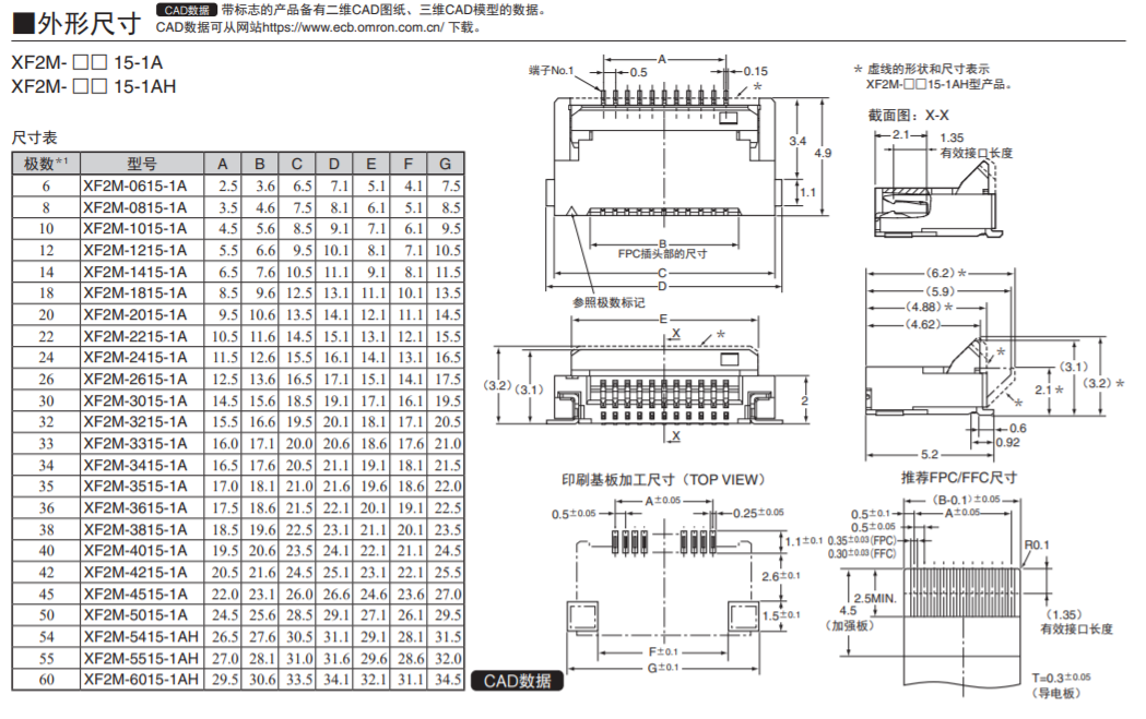 接點構造備有雙面觸點型和上觸點型兩種。 (上接點型只有0.5mm間距)
